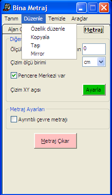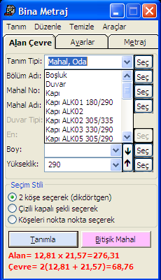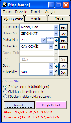 - Programın mahal taban alanlarını ve duvar çevrelerini (alanlarını) hesaplayan modülü tamamlanmıştır. Eskiye göre kat kat daha hızlı, hatasız ve zevkli bir çalışma imkanı sağlamaktadır. AutoCAD içerisinde mahal nolarını, mahal tanımlarını, Pencere, Kapı ve diğer imalat tanımlarını, ölçülerini hem çizimden otomatik olarak alacak, hem de bütün değerlerin manuel olarak değiştirilebileceği bir arayüze sahiptir. Normal metrajlar çizim üzerinde çizim yapılarak tanıtılmakta, Pencere, Kapı gibi minha imalatların ölçüleri çizimdeki ifadelerden (Text, Dimension, Attribute, Block...) otomatik olarak aldırılmakta ve gerekli yerler doldurulmaktadır. Ayrıca metraj tanımında kullanılacak Layer renkleri, çizgi kalınlıkları, Hatch desenleri gibi birçok özellik isteğe göre özelleştirilebilmektedir. Bütün tanımlar bittikten sonra Metraj Çıkar tuşuna basılarak Microsoft Excel içerisine bütün imalatlar ayrıntılı ve açıklamalı bir biçimde çıkarılmaktadır.