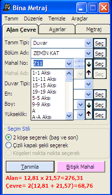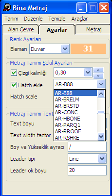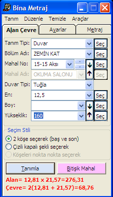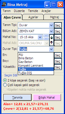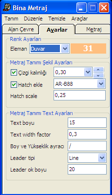 - Duvar modülü tamamlanmıştır. Bu modülle çizim içerisinde seçilen duvar tiplerine göre ayrı ayrı duvar metrajları çıkarılmaktadır. Hazır duvar tiplerinin yanısıra kullanıcı istediği duvar tipi tanımını kendisi de girebilmektedir. ıster sabit duvar kalınlığına göre isterse duvar kalınlıkları çizimden alınarak duvarlar tanımlanmakta ve bütün analizler program tarafından yapılmaktadır.